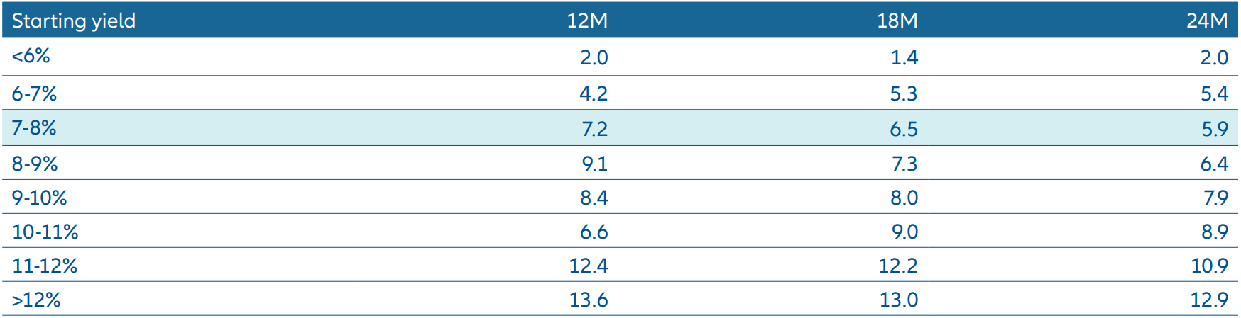 - Current yields in the US high yield bond market have historically been associated with strong returns in the ensuing 12-24 months.