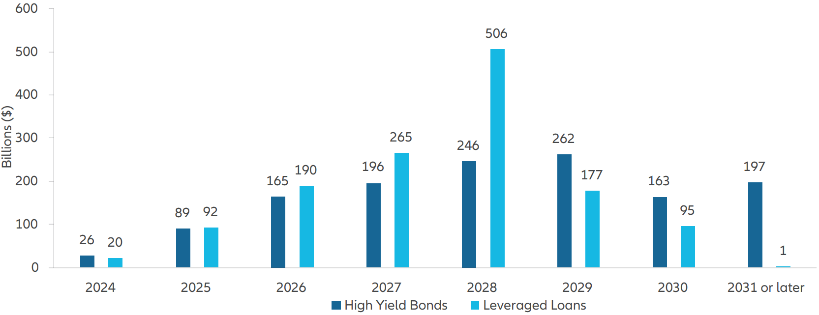- Low maturity wall – High yield investors keep a close eye on when maturing bonds will require issuers to refinance at current market levels (widely known as the “maturity wall”). Currently US high yield issuers’ near-term refinancing obligations are low by historical standards (see Exhibit 2), with only USD 115.3 billion of bonds maturing in 2024-2025.5