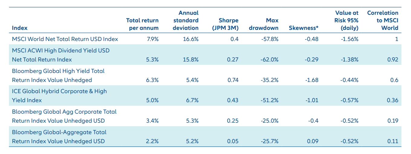 When comparing the risk-return trade-off for major asset classes, a portfolio comprising 50% MSCI World, 25% Global Aggregate Corporate and 25% hybrids stands out for its superior risk-adjusted historical excess returns (see Exhibit 6). This blend captures much of the equity risk premium while substantially reducing volatility and drawdown risk, thanks to the stabilising effect of bonds and the return-enhancing role of hybrids.