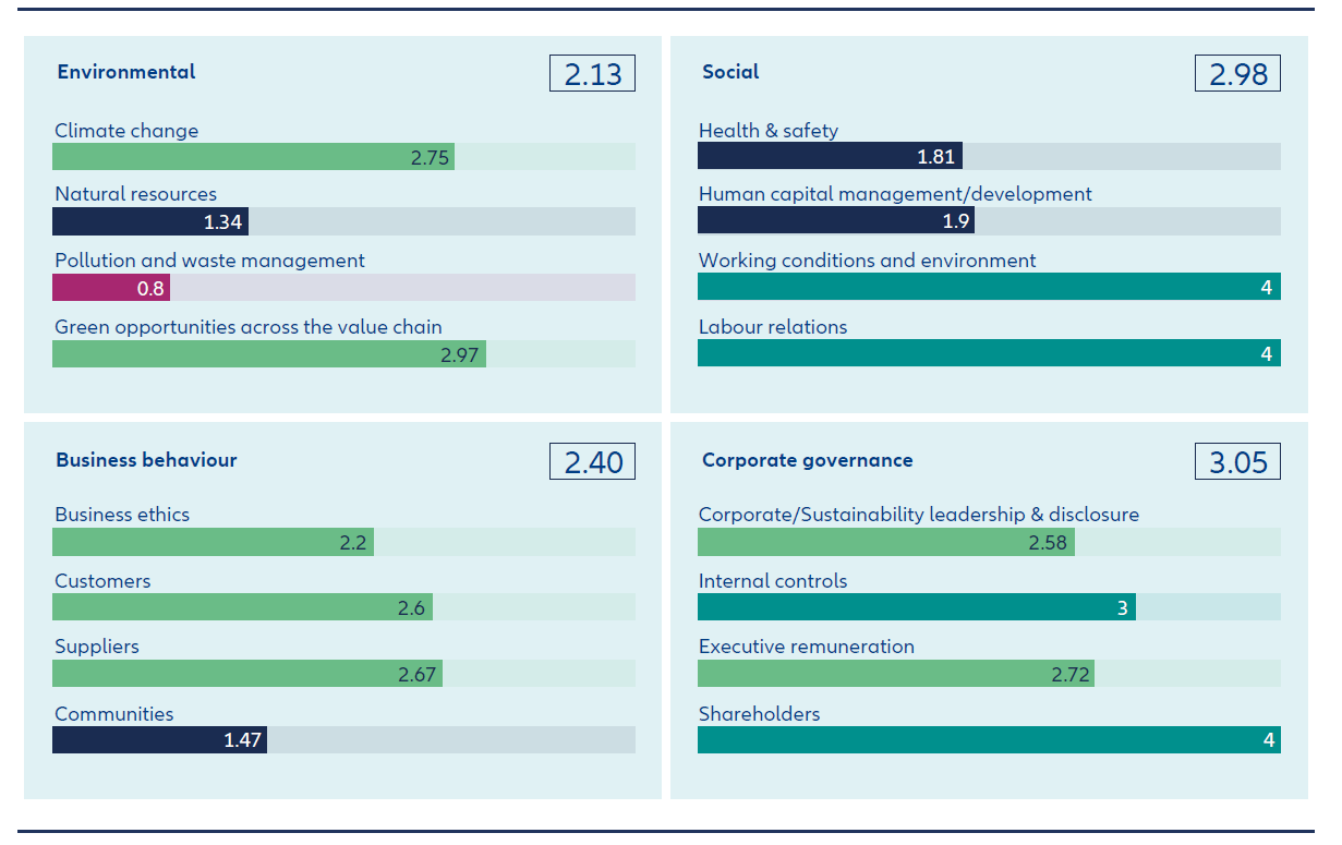 *The Proprietary Sustainability Score is based on third-party ESG data and internal research. It reflects AllianzGI’s Sustainability teams’ subjective view and relies on evolving assumptions. Peer groups for corporates, sectors and regions are defined internally, which may introduce biases. Despite efforts to ensure data quality, gaps, estimates and time lags may affect accuracy. The score is not a definitive measure of sustainability and may be used as one input among others in investment decisions.