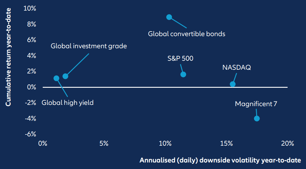 In our view, corporate bonds, including convertible securities, can play a valuable and complementary role for investors rebalancing after a strong equity run, and where conviction in equity multiples is waning. Historically, high yield bonds have delivered equitylike returns with meaningfully lower volatility. February’s market action provides a timely illustration of this dynamic. For example, Oracle’s share price declined roughly 50% from its September highs, while its benchmark 2030 bond fell by just 2% over the same period. Zoominfo’s share price dropped 42% from January highs, yet its benchmark 2029 bond declined roughly 9%. These divergences highlight how credit can absorb volatility without fully repricing long-term solvency risk. At the index level, global high yield and global investment grade bonds have delivered significantly more stable returns year-todate than the S&P 500 and NASDAQ US equity indices, as well as against the socalled "Magnificent Seven“ of dominant US technology stocks. What is more, global convertible bonds, which encompass both debt and equity features, are outperforming by a wide margin and can be effective in dampening downside volatility without sacrificing equity upside participation.