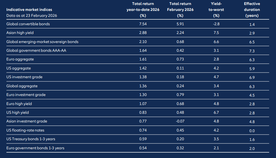 Source: Bloomberg, ICE BofA and JP Morgan indices; Allianz Global Investors, data as at 23 February 2026. Index returns in USD-hedged except for Euro indices (in EUR). Asian and emerging-market indices represent USD denominated bonds. Yield-to-worst adjusts down the yield-to-maturity for corporate bonds which can be “called away” (redeemed optionally at predetermined times before their maturity date). Effective duration also takes into account the effect of these “call options”. The information above is provided for illustrative purposes only, it should not be considered a recommendation to purchase or sell any particular security or strategy or as investment advice. Past performance, or any prediction, projection or forecast, is not indicative of future performance.